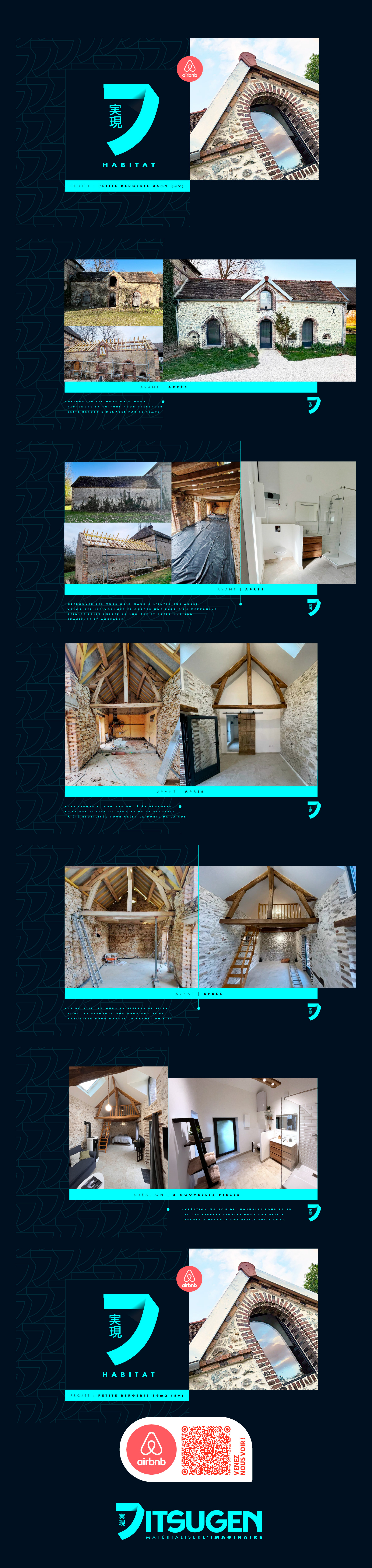 Maisonnette de 36 m² restaurée dans le respect de son identité d’origine, en valorisant les murs en briques et pierres de silex caractéristiques. Nous avons cherché à préserver l’esthétique de bergerie : fenêtres en arches mises en avant, fermes de charpente conservées et sublimées, mezzanine aménagée. Les pierres apparentes, le bois des structures et les volumes sous les pentes participent à une atmosphère authentique et chaleureuse, où patrimoine et usage contemporain s’équilibrent dans une suite Cosy disponible en airBNB